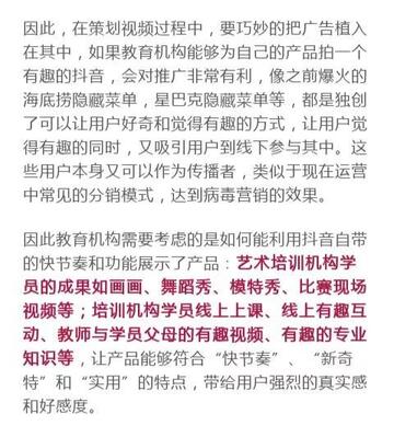 通過以上分析,抖音平臺機構入駐不多,基本是一片藍海。教育機構可以配合產品本身的特點選擇性的去嘗試開拓此免費渠道,需要注意的是,要找到產品本身的話題性和好玩的玩法。